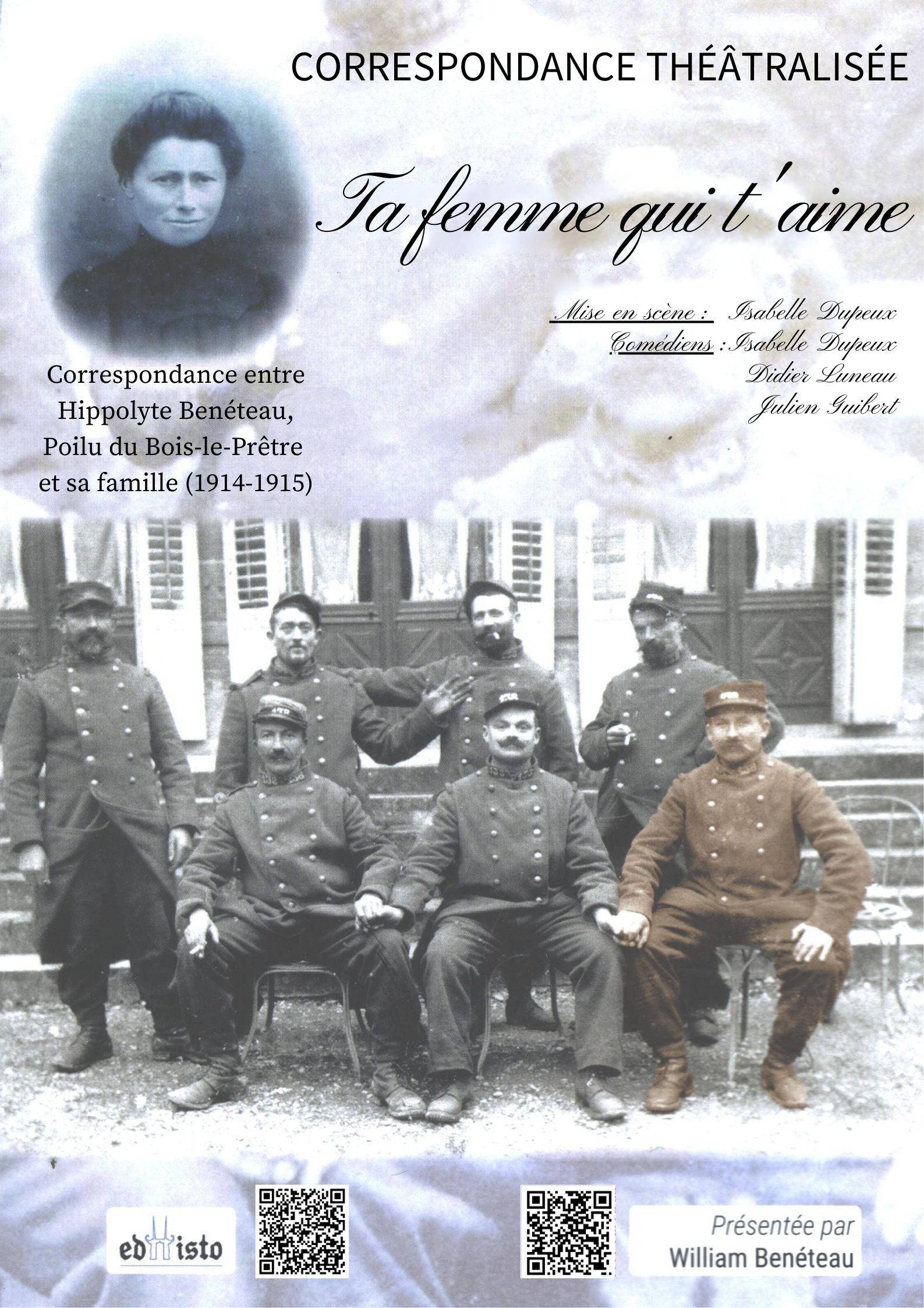 Trois voix : Marie (Isabelle Dupeux) et Hippolyte (Didier Luneau), la voix off (Julien Guibert) pour replacer leur histoire dans la Grande Guerre