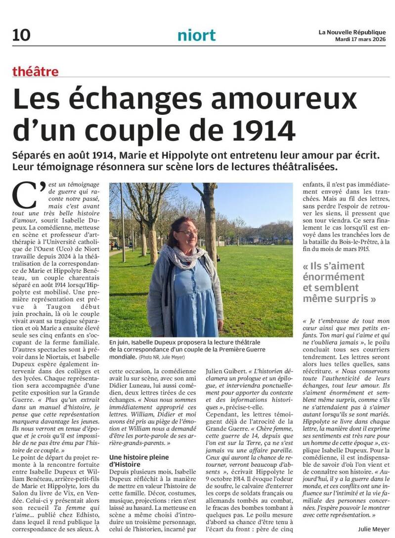 À partir du livre Ta femme qui t’aime, ces lettres retrouvées dans une boîte en fer ont été adaptées pour la scène par une troupe niortaise, sous la direction d’Isabelle Dupeux.